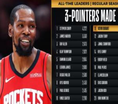 劍指前10杜蘭特生涯三分2283個超特里升歷史第11差7個追平卡特