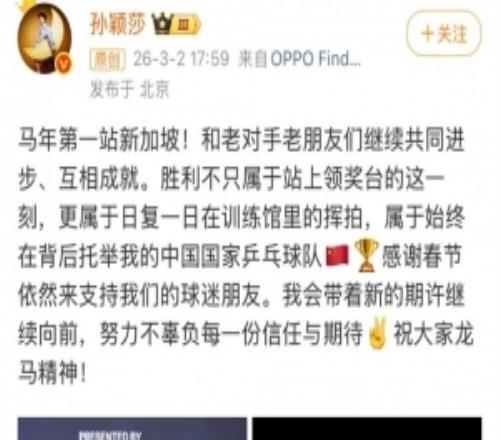新年首冠!孫穎莎社媒:帶著新的期許繼續向前,不辜負信任與期待