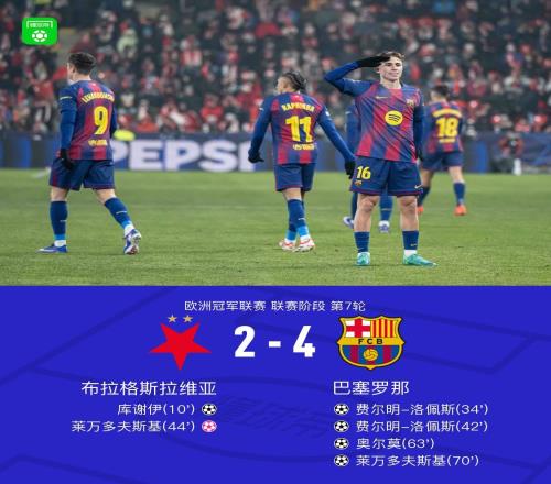 北京時(shí)間1月22日歐洲冠軍聯(lián)賽聯(lián)賽階段第7輪,布拉格斯拉維亞對陣巴塞羅那。上半場庫謝伊幸運(yùn)破門,費(fèi)爾明梅開二...