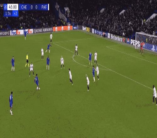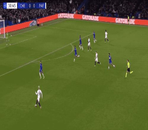上半場(chǎng)補(bǔ)時(shí)階段,切爾西短傳滲透,哈托的小角度射門,被門將撲了出來。