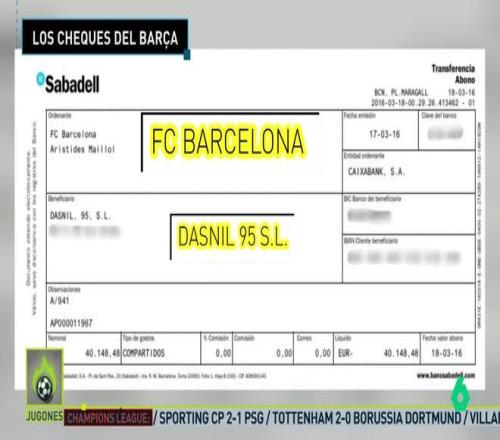 七家銀行已向巴塞羅那第一號(hào)指示法官提交相關(guān)文件,文件明確顯示,巴薩每月會(huì)向內(nèi)格雷拉旗下的Nilsad SA公司開出24張支票,而各相關(guān)賬戶之間,僅本票與支票的往來金額就高達(dá)19萬歐元。