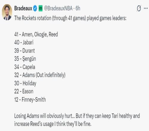 火箭記者Bradeaux曬出本賽季火箭主力們的輪換場次,目前只有阿門、奧科吉、謝潑德三人打滿了41場比賽,而伊森因傷只打22場,亞當斯雖然打了32場但目前已經無限期停賽,火記的意思是只要伊森能繼續保持健康,讓后烏度卡提升謝潑德的登場時間依舊有超強戰力。