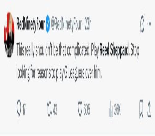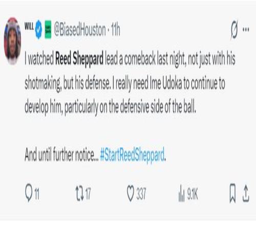 里德-謝潑德在對陣馬刺一戰中大放異彩,末節7中4+三分5中3+罰球2中1拿到12分,他成為火箭逆轉馬刺的第一奇兵,全場比賽拿到21分4助攻2籃板1搶斷1蓋帽4個三分球,謝潑德也因為這場比賽被火箭多位記者盛贊。