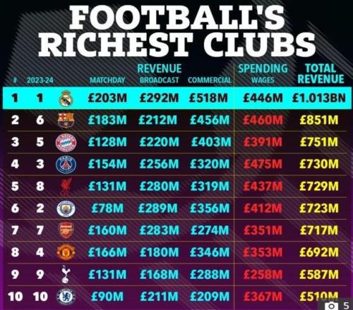 據《每日電訊報》報道,曼聯首次在德勤足球財富榜中被利物浦和阿森納超越,而皇馬仍舊穩居榜首,顯示其在商業上的巨大成功。