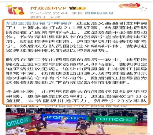 “隨后在第二節山西男籃的最后一攻中,迪亞洛突破上籃和防守球員撞得人仰馬翻,裁判判定迪亞洛進攻犯規。這讓山西男籃主帥潘江指導非常不滿,他情緒激動地進入場內對著裁判示意對手防守時有個壞動作,隨后潘江指導因為這番情緒激動之下的抗議動作而被驅逐。”。