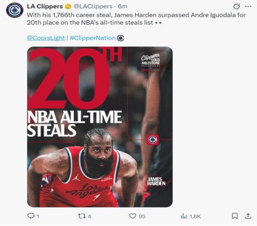 在完成個人職業生涯中的第 1766 次搶斷后,詹姆斯-哈登超越了安德烈-伊戈達拉,升至 NBA 歷史上最搶斷榜的第 20 位。