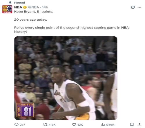 20年前的今天是科比單場81分屠龍大戰,NBA官方發聲回顧。