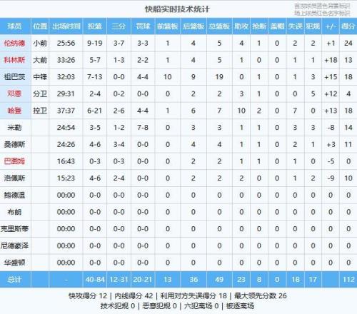倫納德24分5板4助、祖巴茨18分19板、哈登18分7板10助2斷、米勒14分3板1助、科林斯13分5板1助、桑德斯11分4板1助、洛佩斯10分2板2助、鄧恩4分2板3助