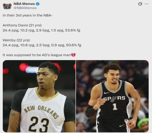 籃球媒體NBA Memes曬出一組數據對比,生涯第三年的濃眉和本賽季的文班亞馬(同樣第三年):濃眉場均24.4分10.2籃板1.5搶斷2.9蓋帽,投籃命中率53.6%;文班場均24.4分10.8籃板0.9搶斷2.5蓋帽,投籃命中率50.6%。