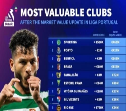 葡超球隊(duì)德轉(zhuǎn)身價(jià)排名:葡體4.65億歐居首,波爾圖、本菲卡二三位