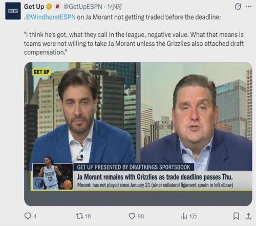 北京時間2月7日,ESPN名記Brian Windhorst在節目中,談及灰熊為何沒能送走莫蘭特:“很多人都說莫蘭特毫無價值,但我覺得這個說法并不準確。因為我認為他現在就是負資產,除非灰熊倒貼選秀權,否則沒有球隊愿意接手。”