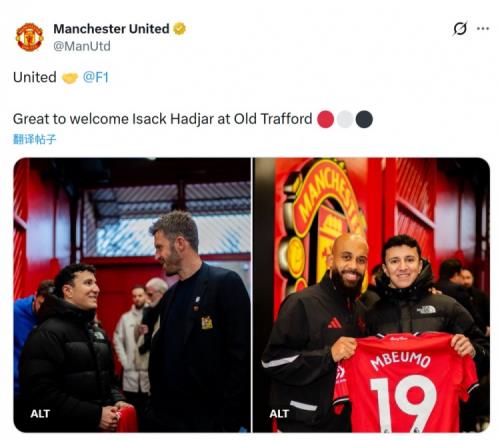 F1紅牛車隊車手哈賈爾造訪老特拉福德,觀看曼聯的比賽,并獲贈姆伯莫的球衣,曼聯官方社媒曬出照片,對他表示歡迎。