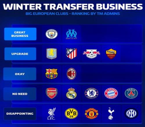 體育播報2月9日宣 冬季轉(zhuǎn)會窗口已經(jīng)關(guān)閉,《轉(zhuǎn)會市場》也對多家俱樂部的冬窗轉(zhuǎn)會操作進行了評級。
