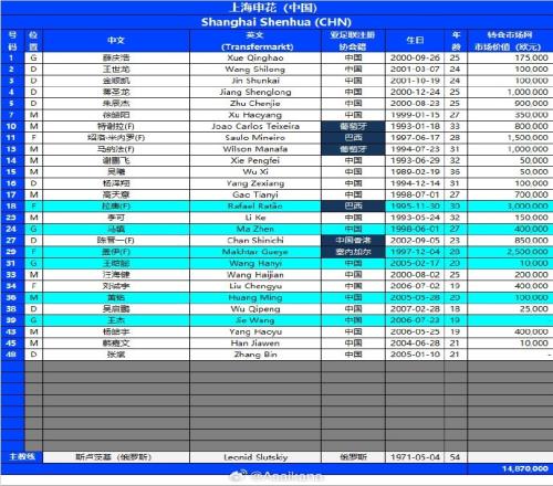 202526賽季亞冠精英聯賽報名名單第三注冊窗口上海申花