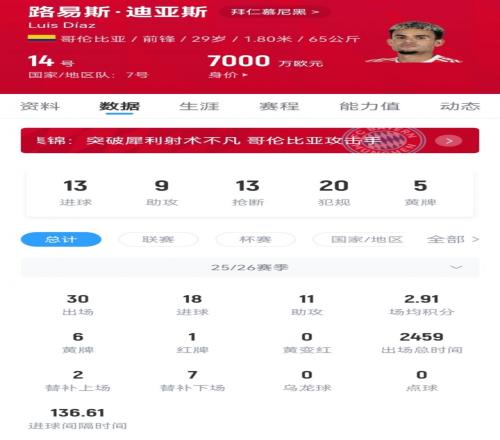 去年夏窗,迪亞斯從利物浦轉會至拜仁,轉會費7000萬歐。來到拜仁之后,迪亞斯無縫銜接,目前共出戰30場,貢獻18球11次助攻。其中在德甲迪亞斯13球9助,在射手榜和助攻榜均排名第二,身前分別是自己的隊友凱恩和奧利塞。