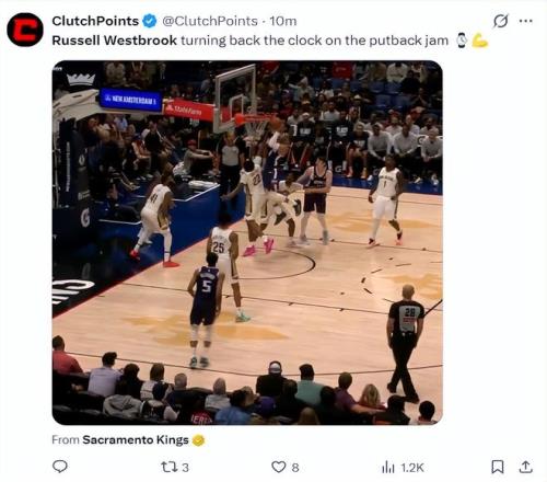 37歲的威少競技狀態依舊非常出色,在隊友上籃不中后,37歲的威少從后方殺出直接高高躍起完成了補扣,這個補扣還隔著一個防守球員,這就是昔日常規賽MVP的硬實力,威少就是NBA歷史上球風最勁爆的控球后衛。