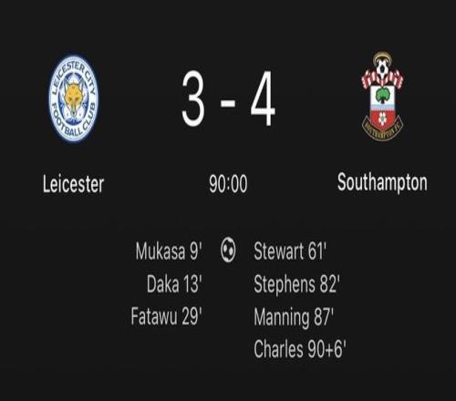 然而眼看勝局在握,萊斯特城卻在下半場離譜崩盤。斯圖爾特、斯蒂芬斯和曼寧在第61分鐘至第87分鐘這短短的26分鐘內連進3球,幫助做客的南安普頓扳平比分。