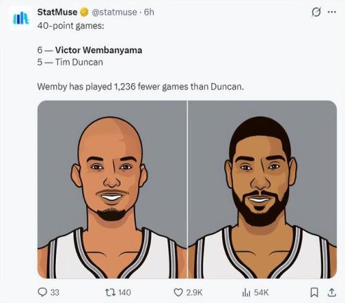 16.文班亞馬拿到第六次40+超越鄧肯,而且比鄧肯少打1236場;