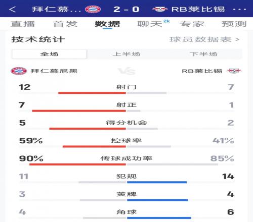 體育播報(bào)2月12日宣 在本輪德國(guó)杯,拜仁2-0擊敗萊比錫,以下為雙方全場(chǎng)數(shù)據(jù)對(duì)比: