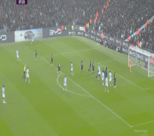 第24分鐘,曼城如法炮制,羅德里將球分到右路,努內斯果斷傳中,哈蘭德頭球沒能頂到,皮球砸在博格的頭上造成烏龍助攻,塞梅尼奧搶射破門。