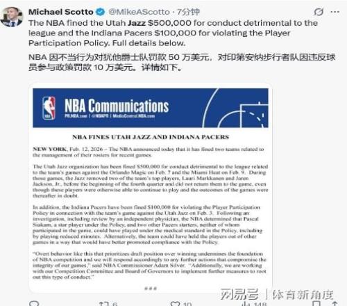 面對輿論風暴,NBA官方于北京時間9時30分重拳出擊:爵士因連續兩場第四節惡意輪休3J與馬爾卡寧被處以50萬美元罰款,步行者則因違規輪休西亞卡姆遭罰10萬美元(兩隊傷病報告均違反聯盟新輪休規定)。聯盟同步發布嚴正聲明:"任何為追求選秀權益而公然犧牲比賽公正性的行為,都將動搖NBA的競技根基。"