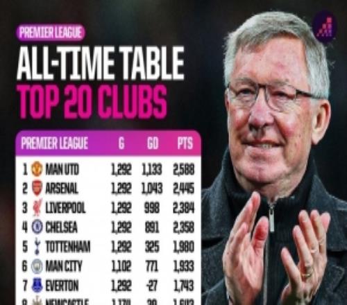 英超歷史總積分榜:曼聯2588分居首,阿森納、利物浦、切爾西前四