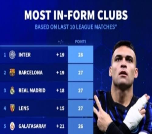 前10聯賽近10輪拿分榜:國米28分居首,巴薩、皇馬、朗斯27分