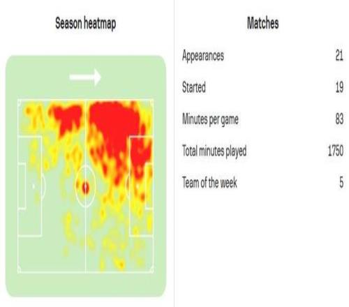 如果現在再回看迪亞斯的參與進球和參與制造得分機會完整點位圖,你會發現,迪亞斯最有威脅的時間主要集中在下半場前半段和后半段,這兩個足球比賽尤為關鍵的時期。本賽季,拜仁在落后或膠著的比賽中,迪亞斯貢獻7球4助,獨造11球,占球隊膠著局進球數的42%。迪亞斯的所有數據,都是在全德甲所有球員壓力值最大的情況下取得的,即便這樣他也竟然也值是本賽季德甲場均評分第二的左邊鋒,但所有數據都能證明迪亞斯有一顆大心臟。