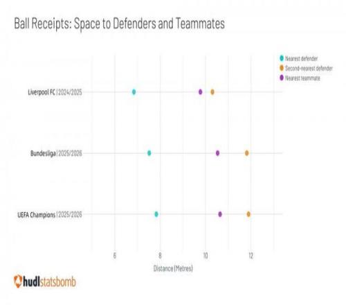 截至英超第23輪,利物浦左路場均突破從迪亞斯離隊前的11.2次降至7.5次,進攻三區傳球成功率從81%跌至65%,造點僅2次,而迪亞斯本賽季在拜仁造點6次,成為德甲造點王。過往在利物浦迪亞斯并不是絕對核心,也不是絕對主力,單看數據他上賽季甚至不如“神秘內切男”加克波,但失去迪亞斯的沖擊力導致利物浦的高位壓迫體系場均前場壓迫次數從18.5次降至15.2次,反擊機會減少35%。