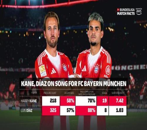 而今年1月9日是,AWS又強調指出:談到壓力,這不僅關乎控球,更體現了在比賽中能否保持頭腦清醒。壓力下傳球成功率衡量球員在防守壓力下成功將球傳給隊友的概率。凱恩在承受壓力時的傳球成功率為78%,但迪亞斯以88%的數據超過了他,展現了即使在最棘手的時刻也有驚人的準確性。衡量處理壓力的關鍵指標是擺脫率,它顯示球員在對手施壓時能夠擺脫防守的概率。凱恩和迪亞斯分別承受了218次和325次壓力。