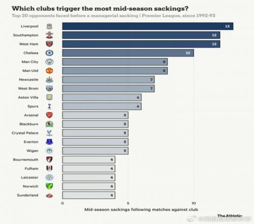 【主帥殺手】TA:英超歷史上共有13位主帥在執教球隊對陣利物浦后被解雇。
