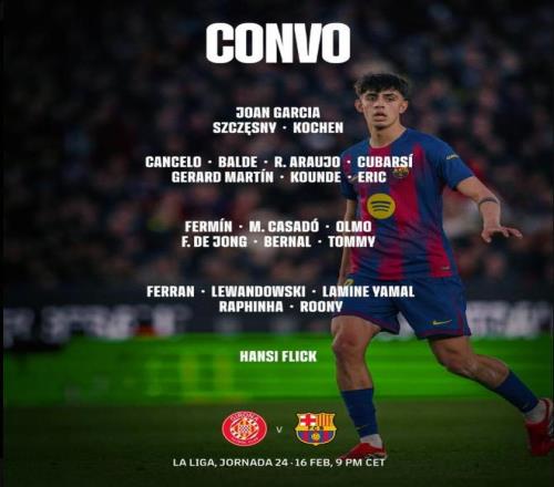 北京時(shí)間2月16日,巴塞羅那官方公布了明天凌晨4點(diǎn)客戰(zhàn)赫羅納的大名單,萊萬(wàn)、亞馬爾領(lǐng)銜,拉菲尼亞回歸。