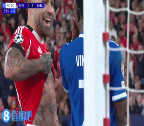比賽第90+5分鐘,奧塔門迪向維尼修斯展示了自己的世界杯冠軍紋身,兩個(gè)人都笑了。