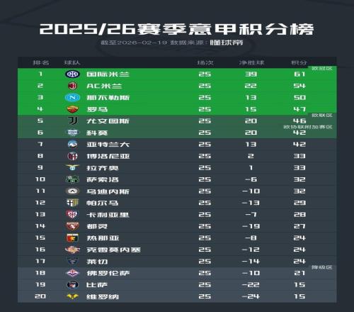 在米蘭于第24輪補賽主場1-1戰平科莫之后,2025/26賽季意甲聯賽已經結束了前25輪的全部比賽。