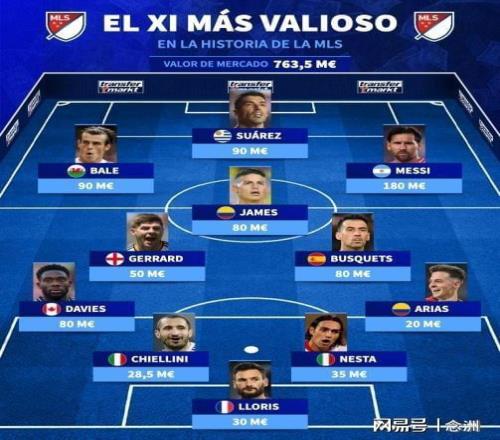 德轉列美職聯球員、以及曾在美職聯效力的球員身價最貴陣,梅西1.8億歐領銜,蘇亞雷斯、貝爾、杰拉德、J羅、布斯克茨在列,中衛組合則是基耶利尼+內斯塔。