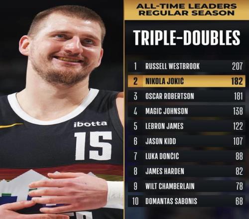 最新榜單里,威斯布魯克常規賽三雙 207次,約基奇 182次,差距是 25次。