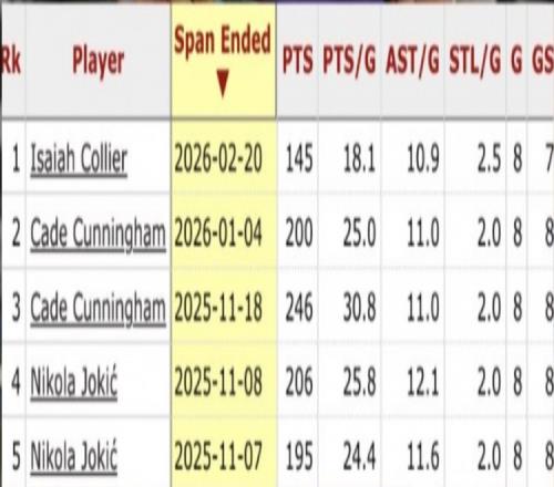 據The Lead統計,科利爾近八場場均18.1分10.9助攻2.5搶斷。而本賽季能做到連續8場比賽有場均至少18分10助攻2搶斷數據的球員僅3人。