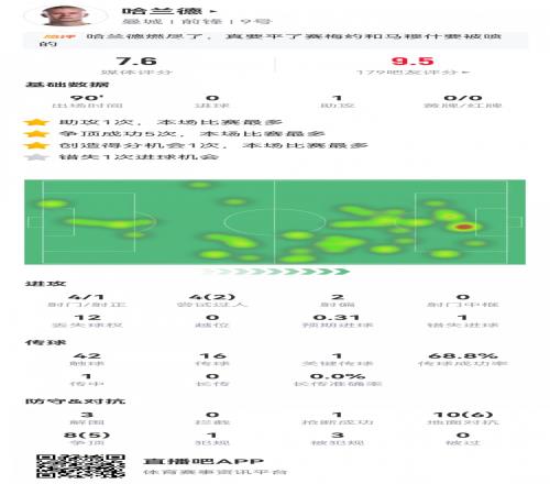 哈蘭德數據:4射1正1助攻,1次錯失進球,11次成功對抗,評分7.6