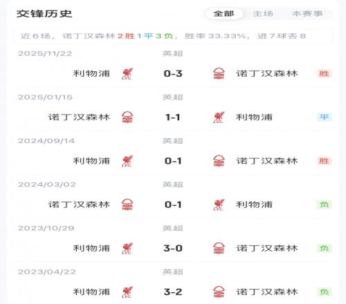 目前,利物浦12勝6平8負積42分位列英超第6,距歐冠區3分;諾丁漢森林7勝6平13負積27分,位列英超第17,領先降級區2分。利物浦近期對陣森林1平2負已三場不勝。