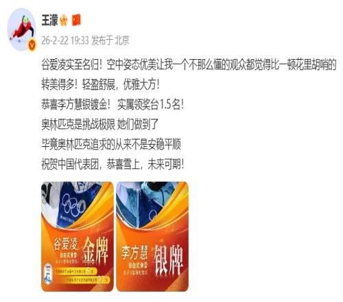 體育播報(bào)02月22日宣 米蘭冬奧會(huì)自由式滑雪女子U型場地技巧決賽,中國選手谷愛凌、李方慧包攬金銀牌,賽后中國短道速滑名將王濛發(fā)微博表示祝賀。
