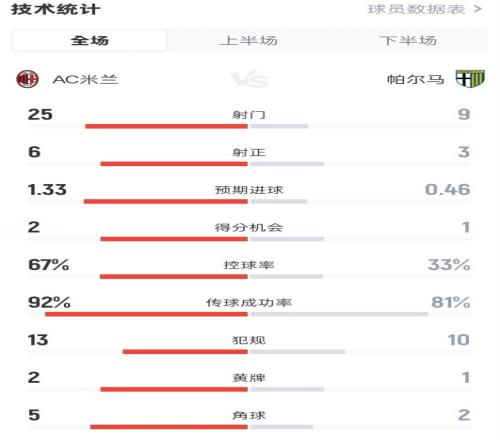 米蘭01帕爾馬全場數據:射門259,射正63,控球率67%33%