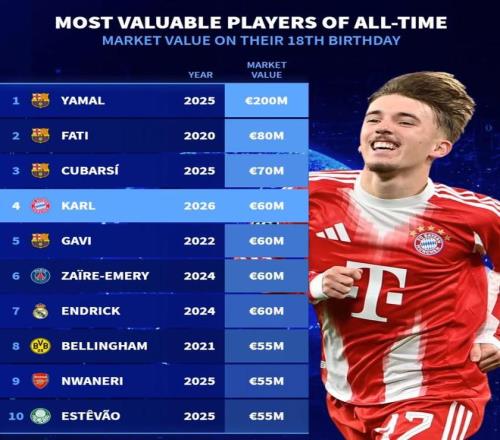 北京時間2月22日,在拜仁慕尼黑新星倫納特-卡爾迎來18歲生日的情況下,德轉統計出了18歲生日當天德轉身價排名前10的球員,倫納特-卡爾位列第四。