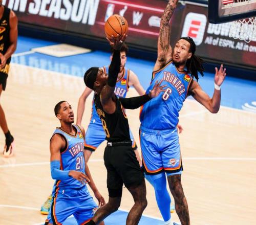 進入下半場,騎士發(fā)力:梅里爾連中兩記三分+急停跳投,莫布里單打霍姆格倫+米切爾快攻拋投,騎士瞬間追平!此后哈登連續(xù)擋拆喂餅阿倫,不過雷霆依靠伊塞亞喬和華萊士屢屢給出回應(yīng),騎士失誤確實有點多。后半段哈滕重扣,伊塞亞喬橫移三分球,雷霆再度拉大分差,危急時刻米切爾大回環(huán)拋射,聯(lián)合泰森再度追平,節(jié)末維金斯跳投+霍姆格倫罰球,三節(jié)打完時,騎士86-89落后。決戰(zhàn)第四節(jié),多特單打+霍姆格倫吃餅扣籃,雷霆再度起勢。莫布里三分球很關(guān)鍵,但肯威和霍姆格倫回應(yīng)5分。