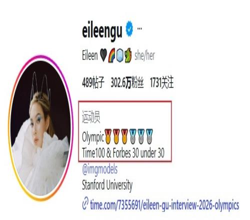 體育播報2月23日宣 谷愛凌奪得米蘭冬奧會自由式滑雪女子U型場地技巧金牌后,更新了自己的社媒簡介,將其改為