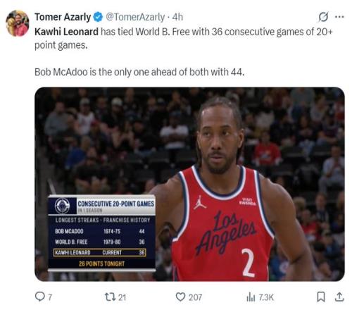 這場比賽后小卡已經連續36場比賽拿到20+排在快船隊史第二,他僅次于麥卡杜的連續44場20+,戰神卡也再度刷新自己連續上雙的場次。