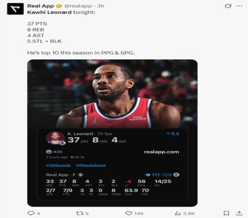 本賽季他得分、搶斷、利用失誤得分、罰球命中率、快攻得分都是聯盟前十的存在,34歲的倫納德真的進入巔峰期了。