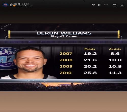 體育播報(bào)2月24日宣 前NBA球員德隆·威廉姆斯更新社媒,轉(zhuǎn)發(fā)了自己在2007年至2010年這四年每個(gè)賽季季后賽的場(chǎng)均數(shù)據(jù)。