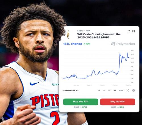 體育播報2月25日宣 體育預測平臺Polymarket數據顯示,坎寧安他的MVP概率在過去一周里已經翻了4倍,來到13%概率。