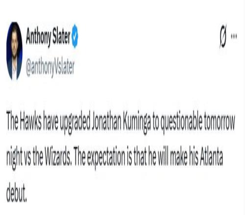 北京時間2月24日,據名記Slater報道,老鷹已將喬納森-庫明加明日對陣奇才的狀態升級為出戰成疑,預計他將在明日完成老鷹生涯首秀。