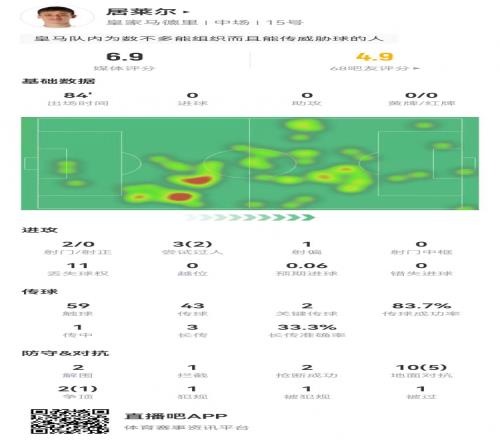 體育播報2月26日宣 皇馬在本輪歐冠附加賽次回合2-1領先本菲卡,居萊爾本場數據如下: